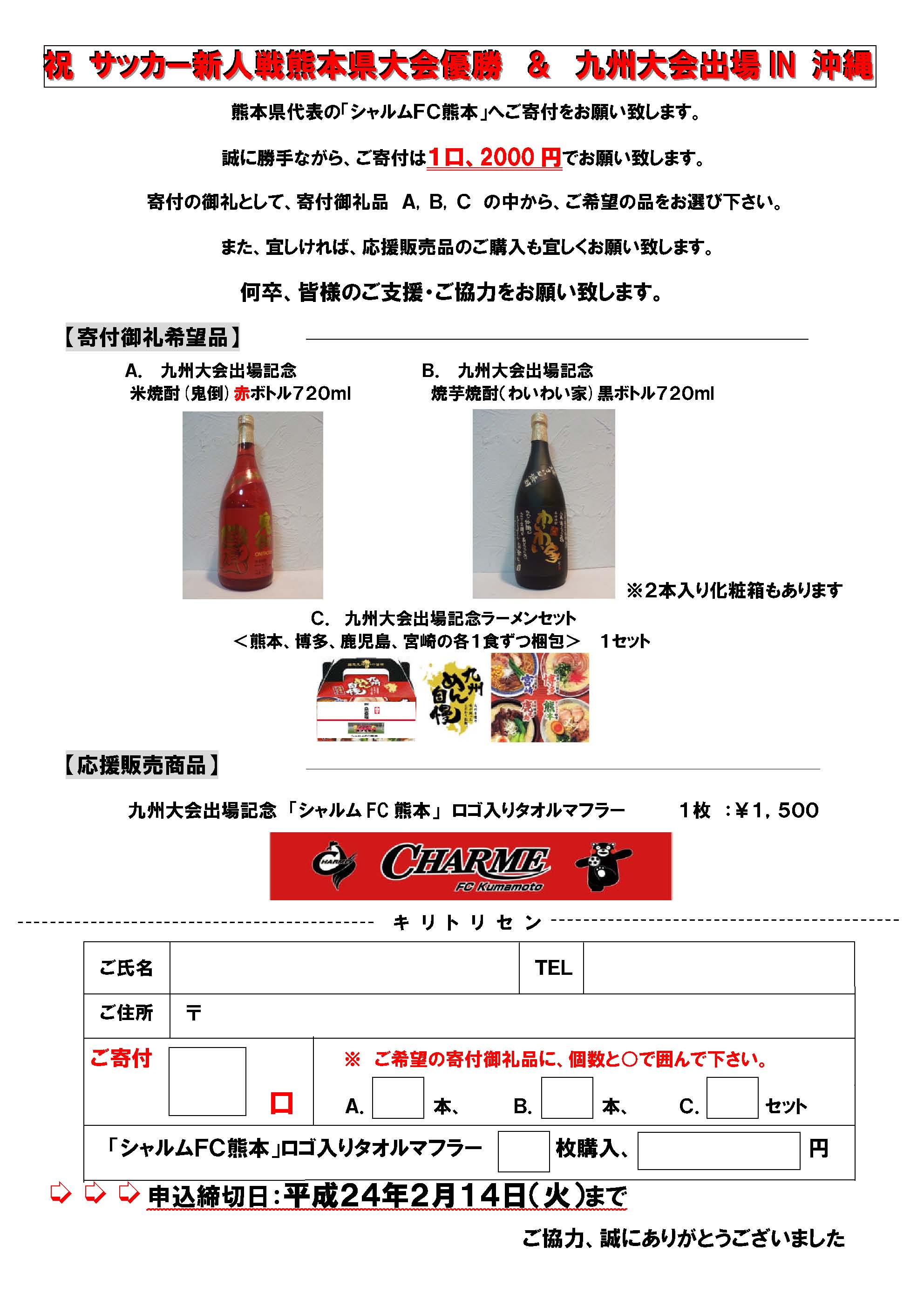 有り難いことに、シャルムFC熊本の九州大会出場に対する寄付をしていただきました。